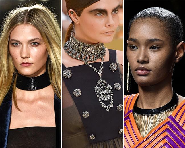 Ami 2015-2016 ősz/tél divatékszer trendjét illeti, még mindig az első helyek között kell megemlíteni a rövid gallér fémes nyakláncokat. Első ránézésre szinte félelmet keltenek ezek a szűk, merev, szinte már a rabszolgákra emlékeztető fojtogató , nagy láncszemes fémláncok. Érdekes, izgalmas fazonokban vonultak fel a modellek Narciso Rodriguez kifutóján csavart futurisztikus hatású, Louis Vuitton bőr nyakláncaiban Nicolas Ghesquiere divattervező által, Givenchy kristályos statement choker nyakláncaival, és nagy divat továbbra is a hosszú arany és ezüst vékony láncokból álló merev nyakláncok.