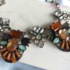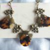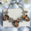 Műanyag párducmintás dísszel, borostyánsárga, clear és zöld kövekkel kirakott nyaklánc.