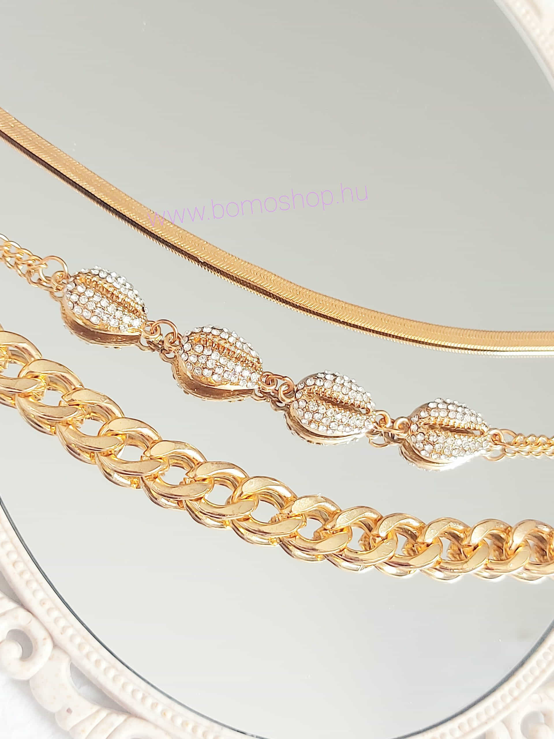 Kristályokkal díszített, és lapos arany színű lánccal.